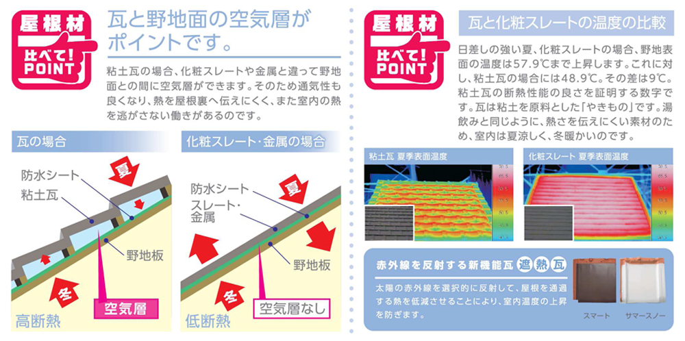 瓦の中には空気の層があり、金属などで作られた他の屋根材よりも高い断熱性を持ちます。夏涼しく冬暖かい、快適な室内環境を保ちます。